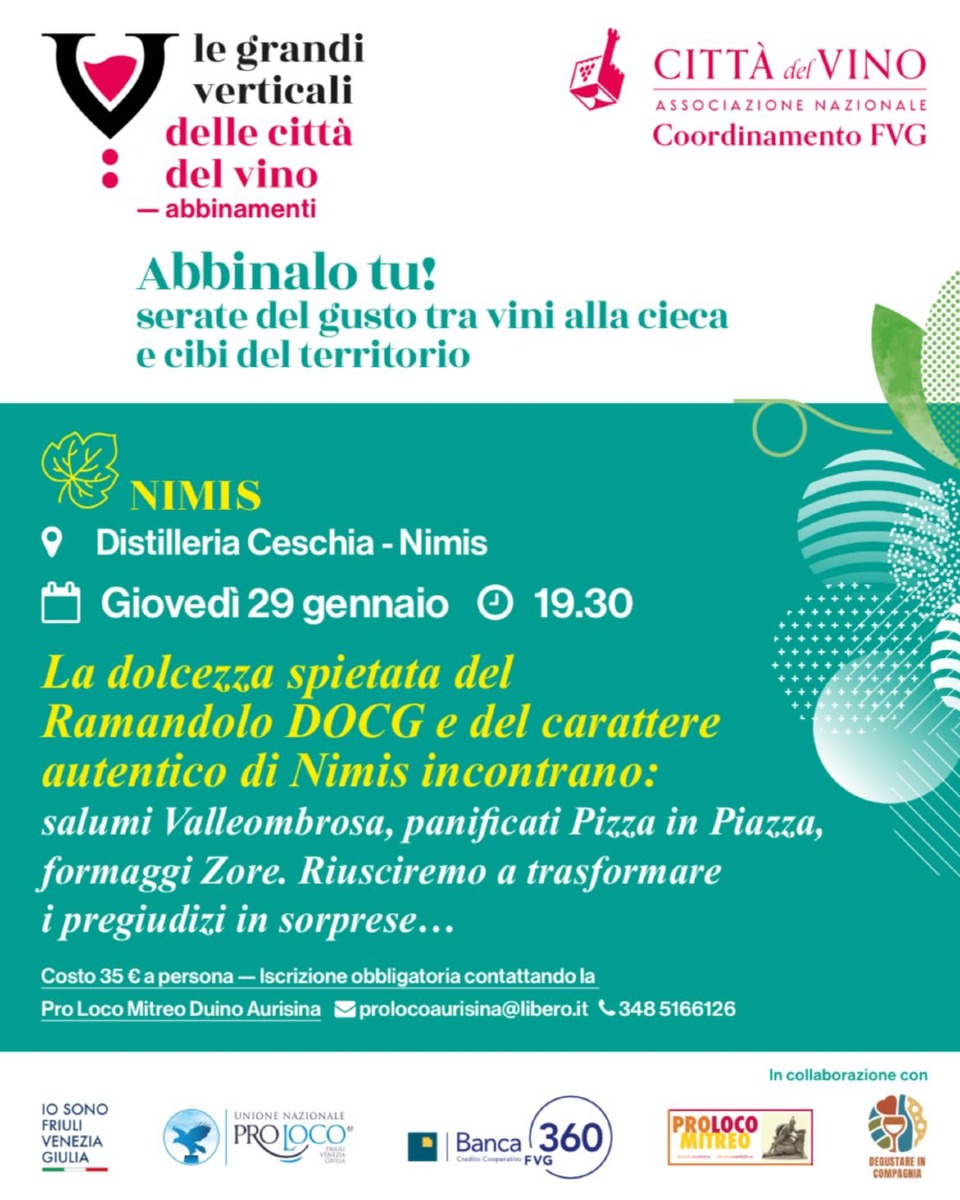 NIMIS (UD) - Dopo il positivo esordio a San Dorligo della Valle / Dolina, prosegue il programma della terza edizione de “Le Grandi Verticali delle Città del Vino”, serie di tappe sul territorio alla scoperta dei vini autoctoni in abbinamento a sapori locali con l'organizzazione dal Coordinamento regionale delle Città del Vino del Friuli Venezia Giulia. Lo slogan scelto in questo 2026 è “Abbinalo tu!”, proprio per raccontare come i partecipanti potranno scoprire insoliti e speciali abbinamenti enogastronomici.