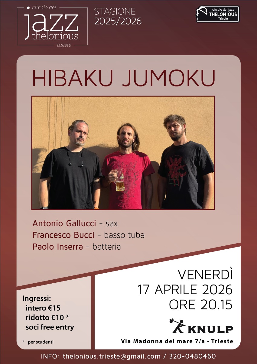 TRIESTE - Venerdì 17 aprile alle ore 20.15 preso il Knulp in via della Madonna del mare 7/a a Trieste, il Circolo del Jazz Thelonious presenta HIBAKU JUMOKU (Antonio Gallucci - sax / Francesco Bucci - basso tuba / Paolo Inserra - batteria).