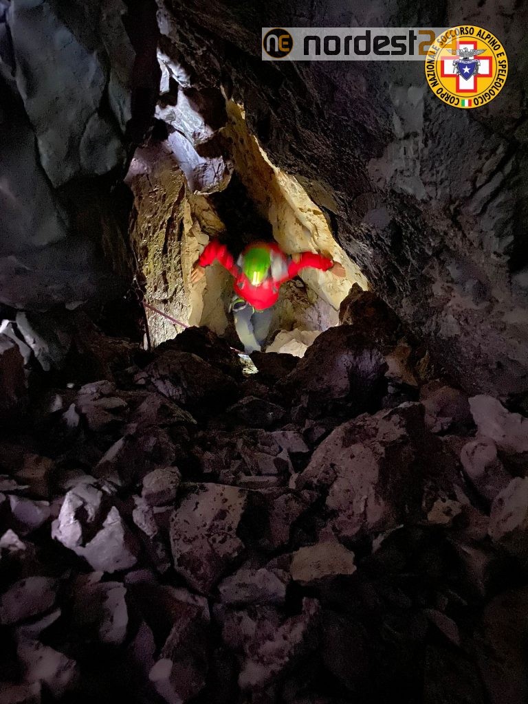 Cimolais (PN). E' salvo lo speleologo di Roveredo in Piano rimasto in grotta ferito tutta la notte. Lo han tenuto al riparo dalla pioggia fino a poco dopo le sei del mattino a cinque metri dall'uscita, mentre il padre è stato fatto uscire e ha atteso a Casera Lodina quando è arrivato il cambio degli speleologi.
