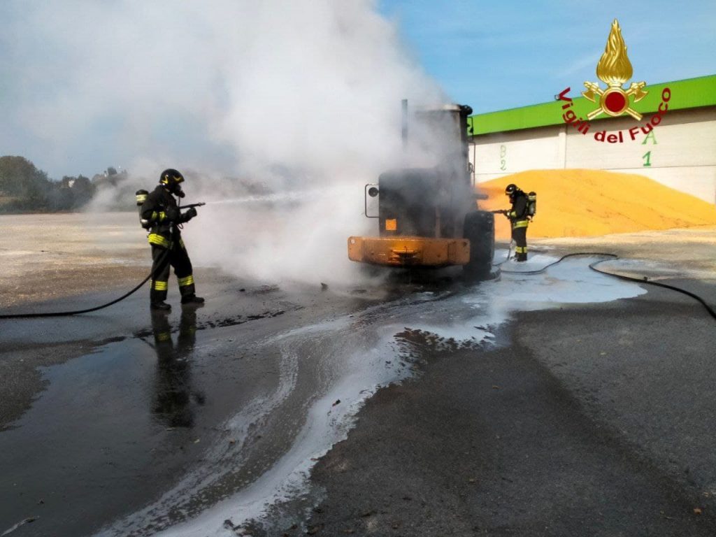 PRATA DI PORDENONE. La prima partenza e l'autobotte dei vigili del fuoco di Pordenone sono intervenute oggi sabato 2 ottobre 2021 in mattinata presso il consorzio agrario di Prata di Pordenone per l'incendio di una pala gommata.