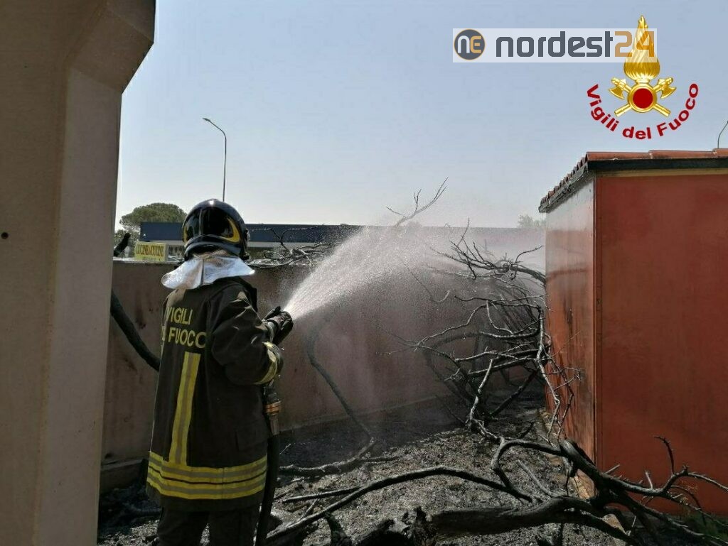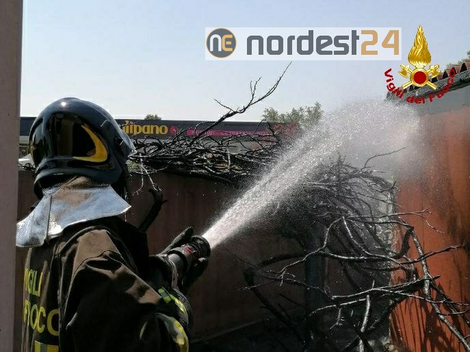 Il tempestivo intervento dei Vigili del fuoco ha evitato la propagazione delle fiamme dalla vegetazione alle strutture del capannone.