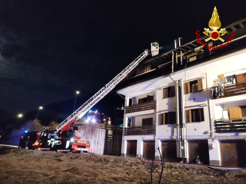 TARVISIO. Dalle ore 2.45 del 20 marzo 2022 squadre dei Vigili del fuoco dei distaccamenti di Tarvisio, Pontebba e della sede centrale di Udine stanno intervenendo per l'incendio del tetto di uno stabile di quattro piani fuori terra sito in Via Picech a Tarvisio (UD).