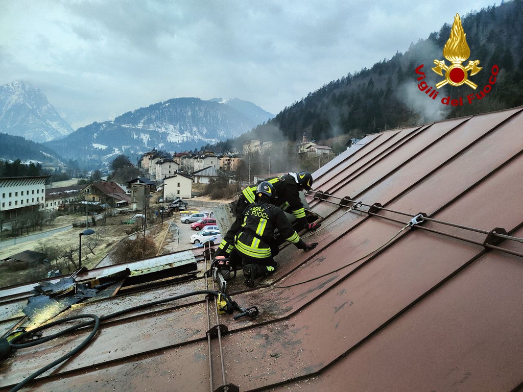 TARVISIO. Dalle ore 2.45 del 20 marzo 2022 squadre dei Vigili del fuoco dei distaccamenti di Tarvisio, Pontebba e della sede centrale di Udine stanno intervenendo per l'incendio del tetto di uno stabi...