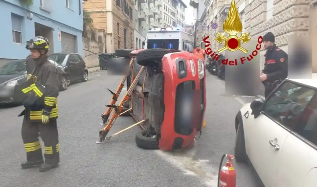 Incidente in via Commerciale a Trieste: auto si ribalta, intervengono Vigili del Fuoco, 118 e Carabinieri. Conducente estratta e affidata ai soccorsi.
