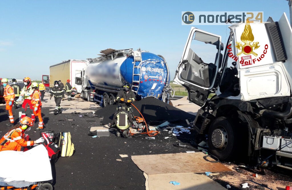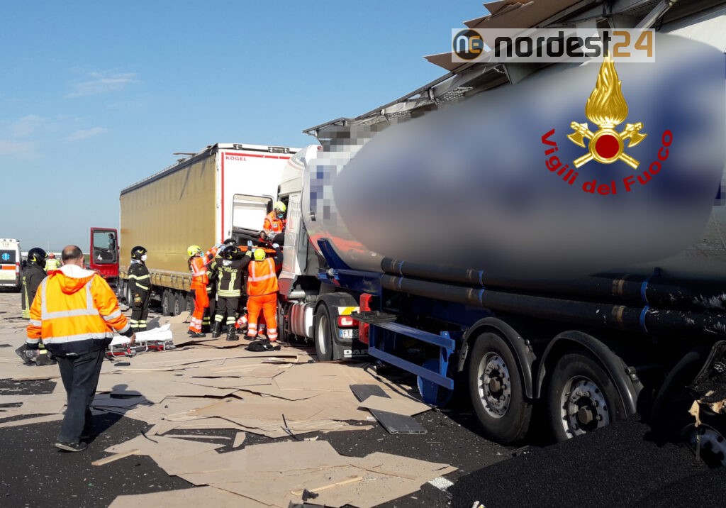Interrotto il traffico autostradale in direzione Venezia. Sono ora in corso le operazioni di rimozione dei mezzi e dei detriti dei carichi persi dai mezzi pesanti.