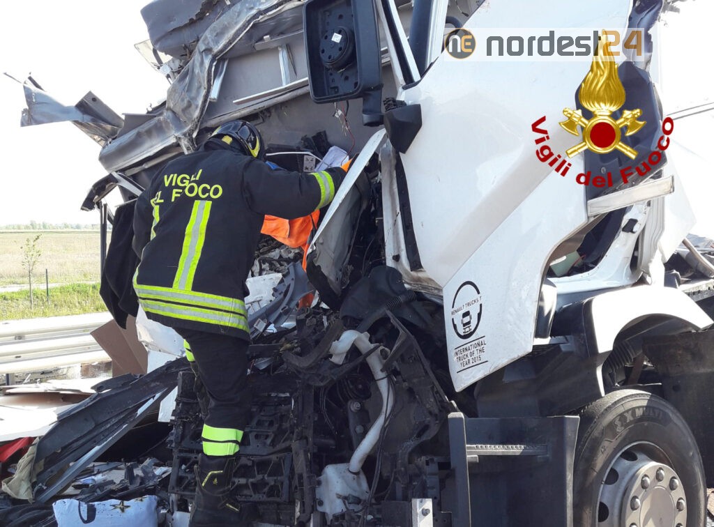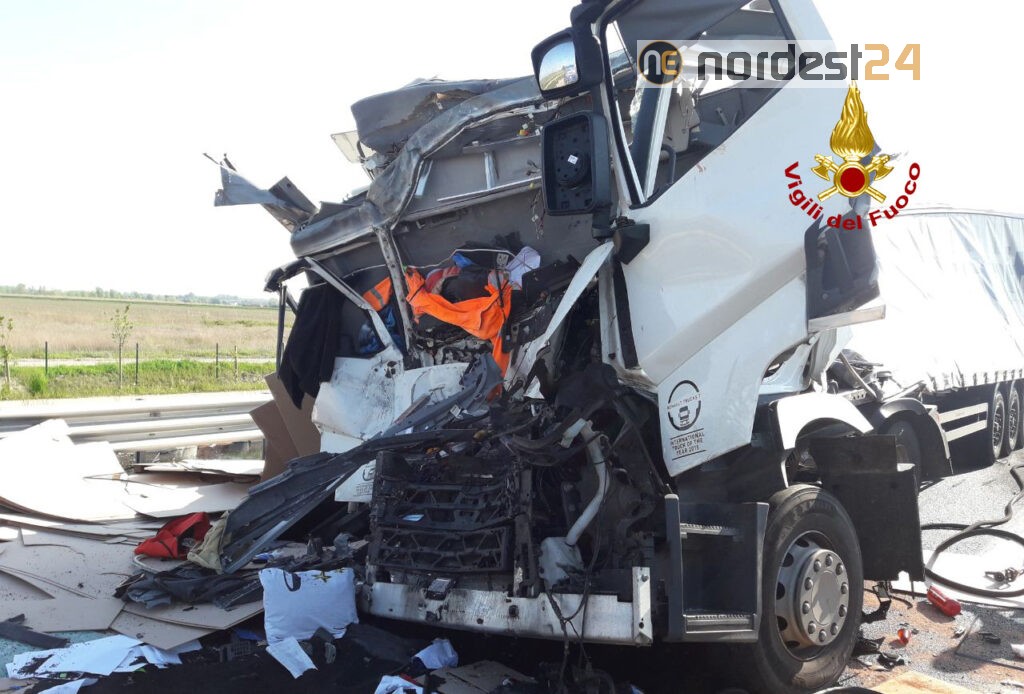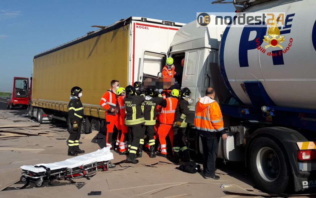 I pompieri arrivati da Portogruaro, Latisana Mestre con l’autogrù, hanno messo in sicurezza i mezzi e utilizzando cesoie, divaricatori e martinetti idraulici liberato un autista rimasto incastrato nella cabina di un camion.
