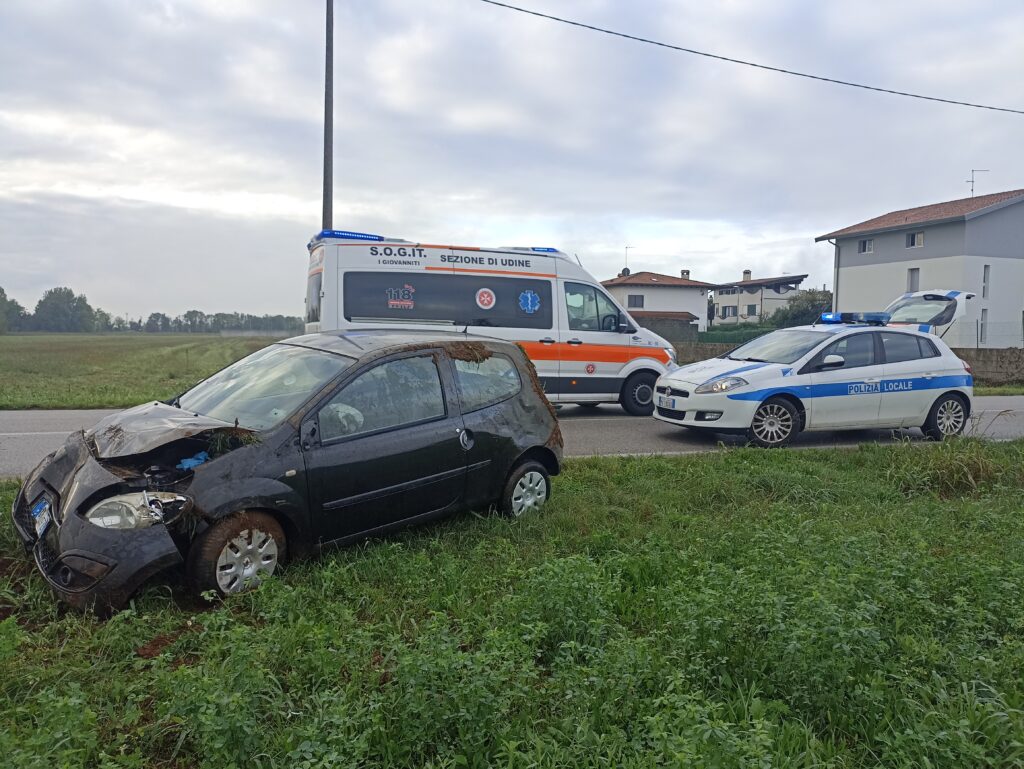 Per cause in fase di accertamento da parte della Polizia Locale, la conducente di una Renault Twingo, proveniente da Udine e diretta verso la SR353, ha perso il controllo del veicolo, andando a impattare contro un palo Telecom per poi finire la corsa nel terreno attiguo.