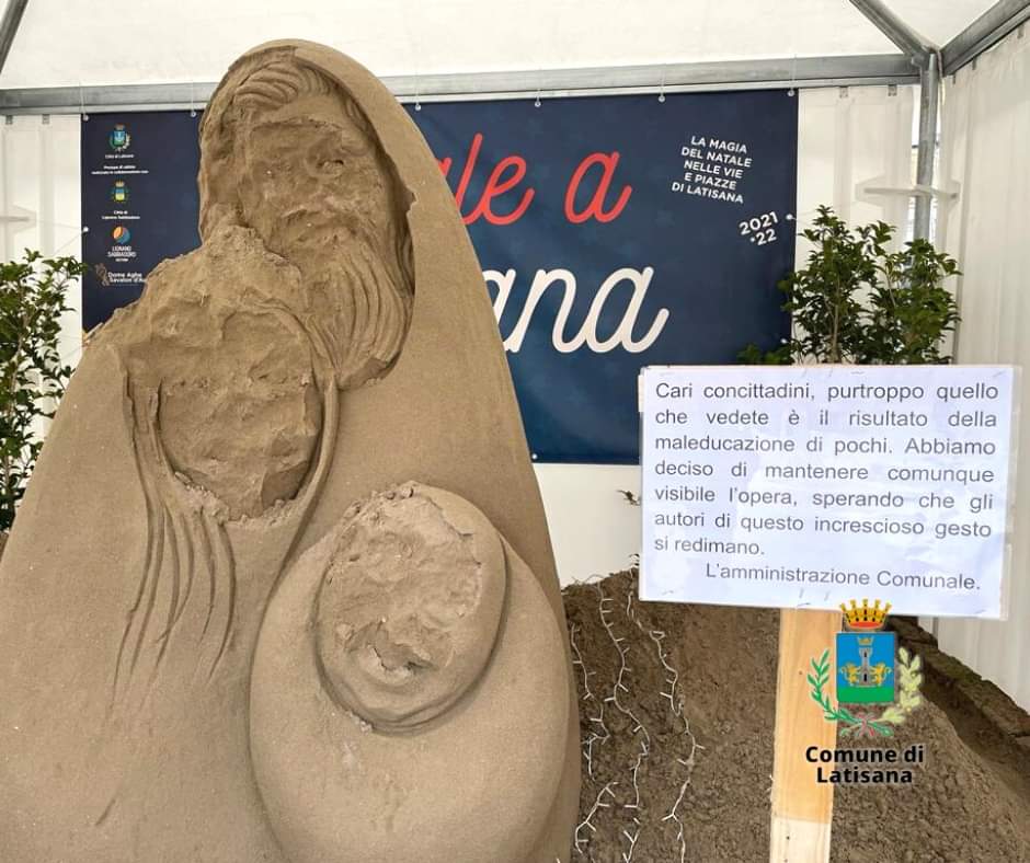 LATISANA. "Cari concittadini, purtroppo quello che vedete è il risultato della maleducazione di pochi. Abbiamo deciso di mantenere comunque visibile l'opera, sperando che gli autori di questo increscioso gesto si redimano".