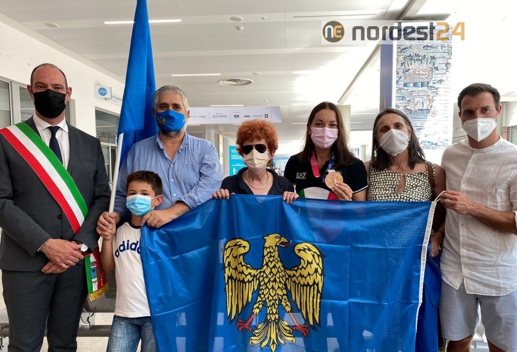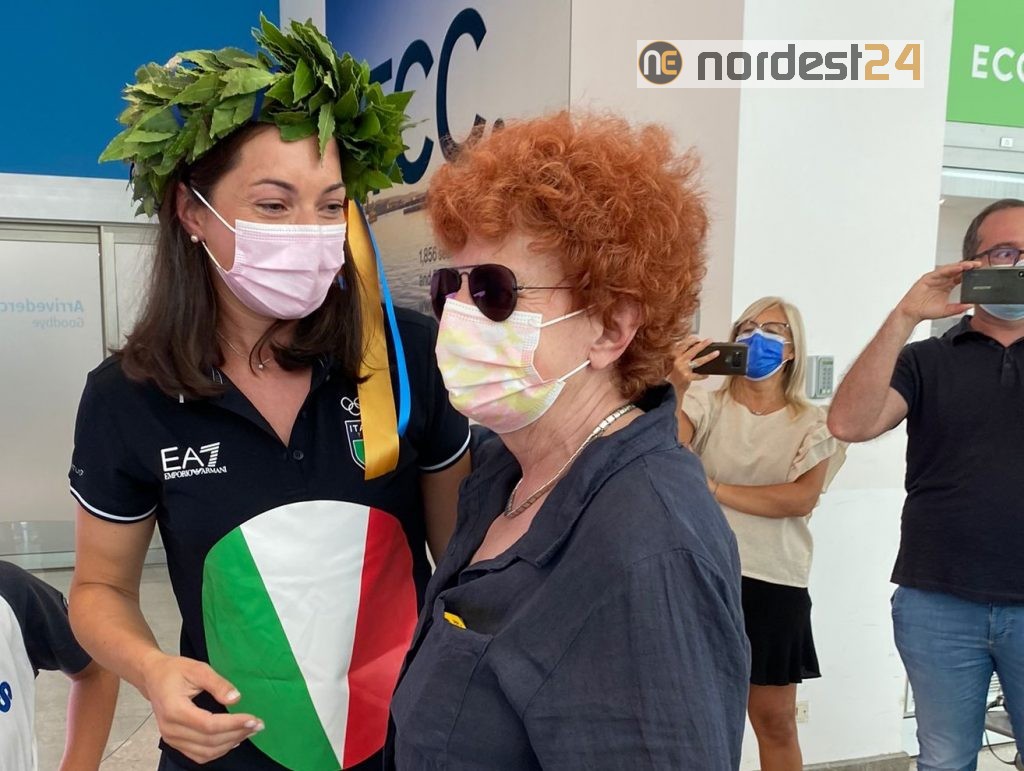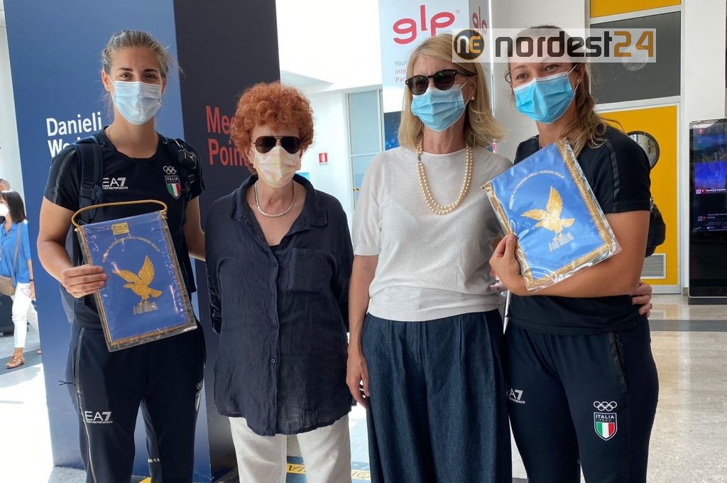 Ronchi dei Legionari, 29 lug - Una corona di alloro decorata con nastri azzurro ed oro per la spadista di Carlino e i gagliardetti per le due atlete del softball residenti in regione. Sono stati questi gli omaggi che l'assessore allo Sport del Friuli Venezia Giulia Tiziana Gibelli ha donato oggi a Mara Navarria, Andrea Howard e Marta Gasparotto di rientro da Tokyio, atterrate nel pomeriggio all'aeroporto di Ronchi dei Legionari.