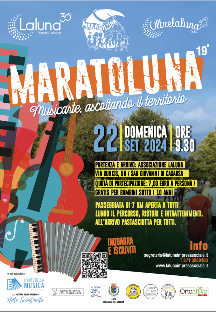La Maratoluna si inserisce nella rassegna “Note Sconfinate”, sostenuta dalla Regione, e quest’anno l’associazione Laluna Impresa Sociale, in collaborazione con L'Arte della Musica e Oltrelaluna, con il supporto della Città di Casarsa della Delizia, organizza una camminata di 7 km aperta a tutti. Il percorso, che avrà partenza e arrivo presso la sede di Laluna in via Runcis alle ore 9.30, attraverserà le incantevoli campagne di San Giovanni e zone limitrofe, passando per chiese, monumenti e luoghi suggestivi.