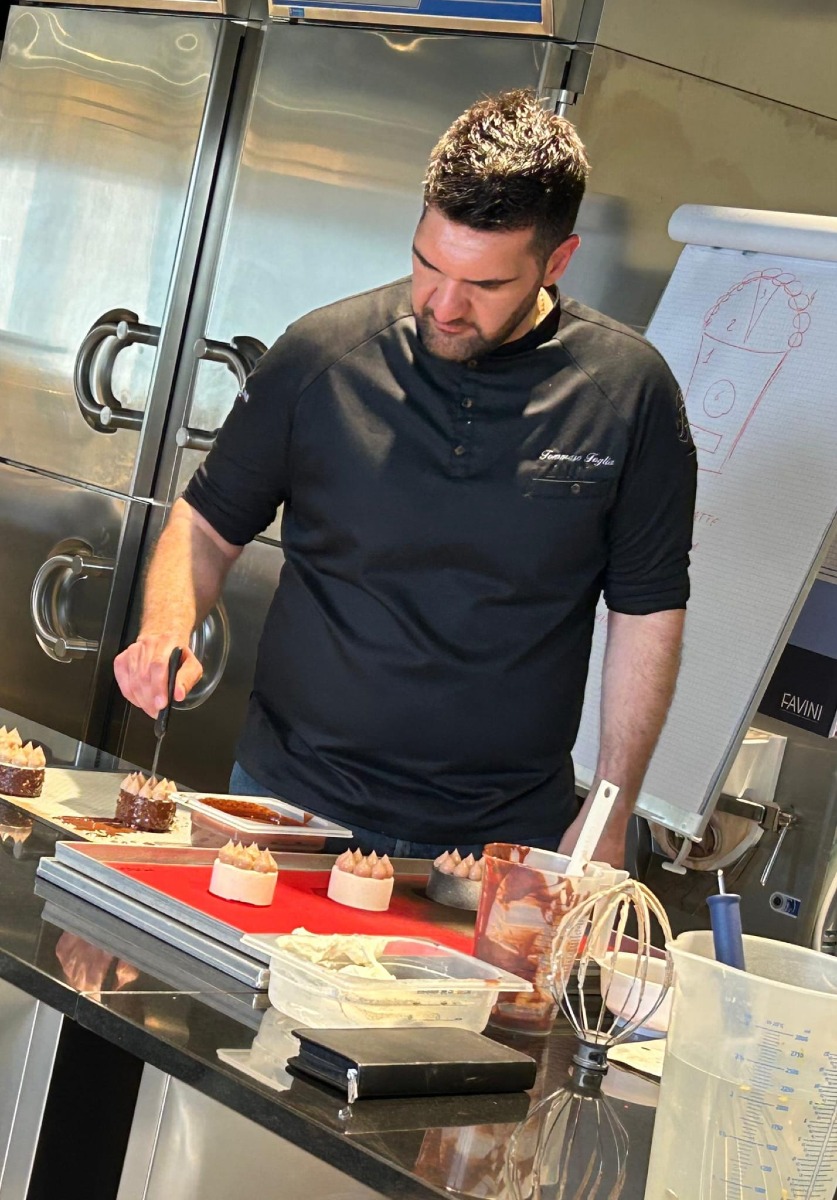 Durante la giornata a Etica Academy, Foglia ha dato vita a una lezione intensa e coinvolgente, realizzando dessert eleganti, contemporanei e replicabili, mostrando un utilizzo del cioccolato che spazia tra tecnica e creatività.