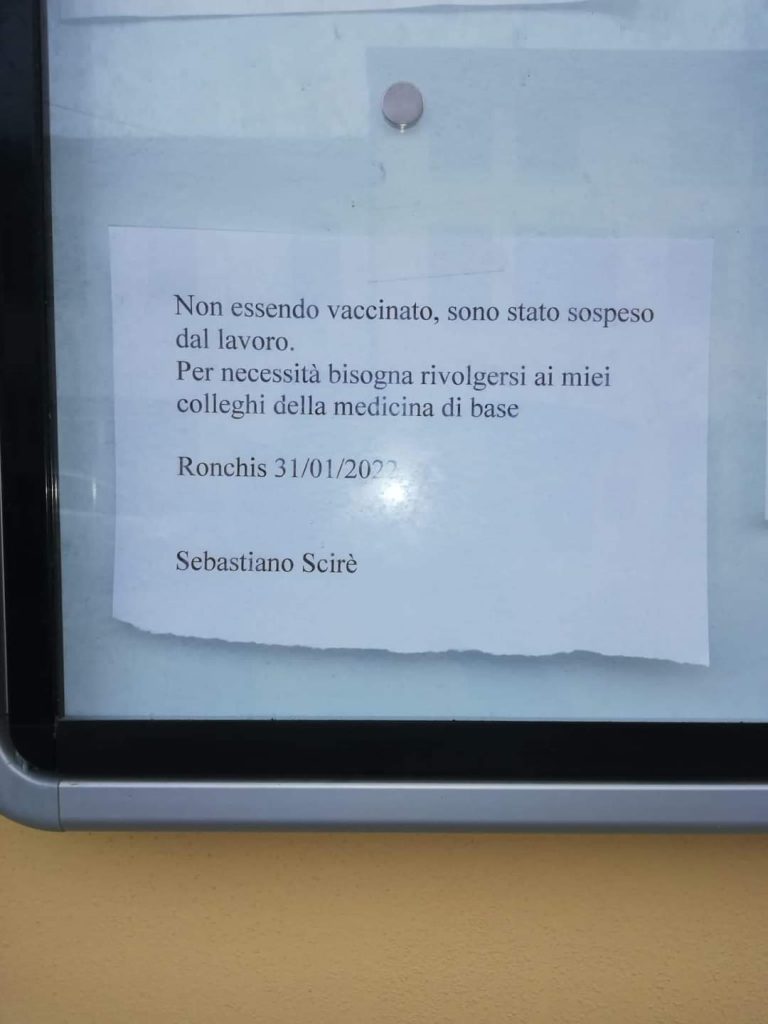 RONCHIS (UD). Amara sorpresa nella giornata di oggi, lunedì 31 gennaio 2022, a Ronchis in provincia di Udine, per molti assistiti, che fuori dalla porta, affisso in vetrata, nell’ambulatorio del loro medico di base hanno trovato un cartello: “Non essendo vaccinato, sono stato sospeso dal lavoro. Per necessità bisogna rivolgersi ai mei colleghi della medicina di base”. “Un medico, che alla base della sua formazione aveva messo la scienza, la ricerca, l’uso dei farmaci per contrastare le malattie - tuona Elisa, una sua assistita - di colpo lo si scopre avversario dell’unica arma oggi a disposizione dell’uomo per contrastare la Pandemia, il vaccino”. Il medico di medicina generale, Dott. Sebastiano Scirè, fino a poche ore prima da quel “cartello” aveva esercitato per alcuni anni in paese in via Maggiore 5. “Nessuno e dico nessuno mi aveva avvisato – riferisce il sindaco di Ronchis Manfredi Michelutto - , domani sarò costretto a segnalare il tutto al Prefetto, del resto io non ho possibilità di intervenire in alcun modo pur essendo il responsabile della salute pubblica”. Intanto dalla stessa amministrazione comunale fanno sapere che in sostituzione del Dottor Scirè ci si può rivolgere ai medici di zona, a questo link.