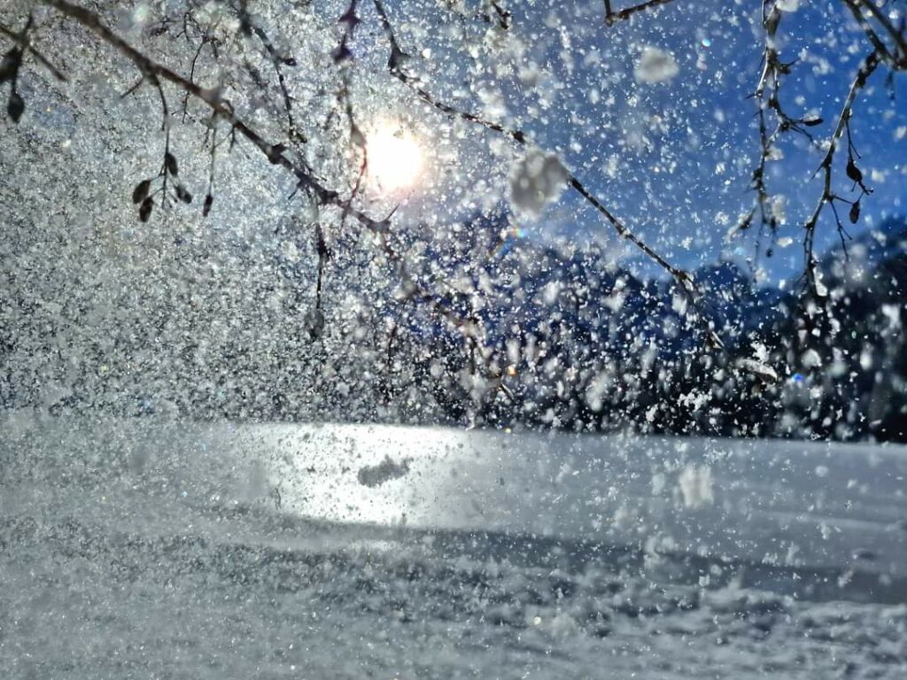 Il sole, elemento centrale in queste fotografie, gioca con i cristalli di neve creando un'atmosfera quasi fatata. Il cielo azzurro, privo di nuvole, fa da sfondo perfetto, esaltando i colori vividi e la luminosità del paesaggio.