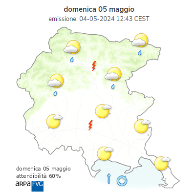 Domenica 5 maggio 2024, il Friuli Venezia Giulia sarà influenzato da un contesto meteorologico piuttosto variabile. Nonostante una rimonta anticiclonica sull'Italia, l'afflusso di correnti meridionali umide nei bassi strati atmosferici contribuirà a creare condizioni di instabilità, soprattutto in prossimità delle zone alpine.