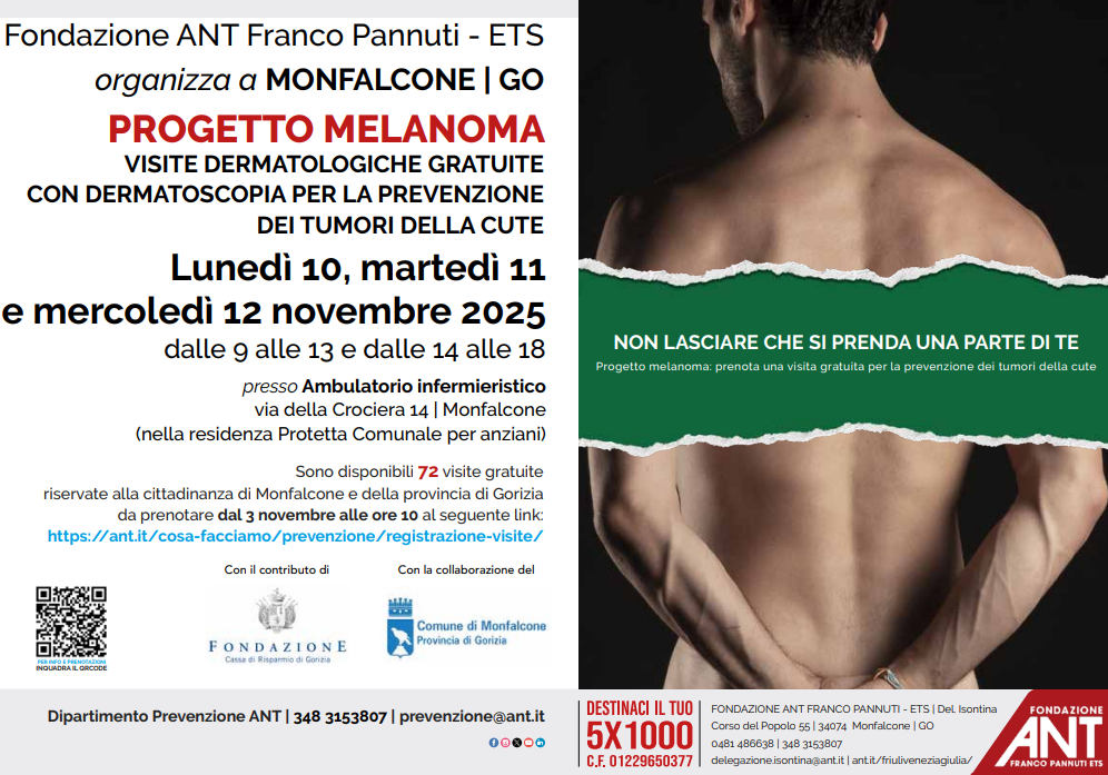 MONFALCONE (GO) – Tre giornate dedicate alla prevenzione del melanoma e alla diagnosi precoce dei tumori della pelle: dal 10 al 12 novembre la Residenza per Anziani di Monfalcone ospiterà l’iniziativa “Progetto Melanoma”, organizzata grazie alla collaborazione tra il Comune di Monfalcone e la Fondazione ANT “Franco Pannuti” ETS, da sempre impegnata nella prevenzione oncologica e nell’assistenza ai malati di tumore.