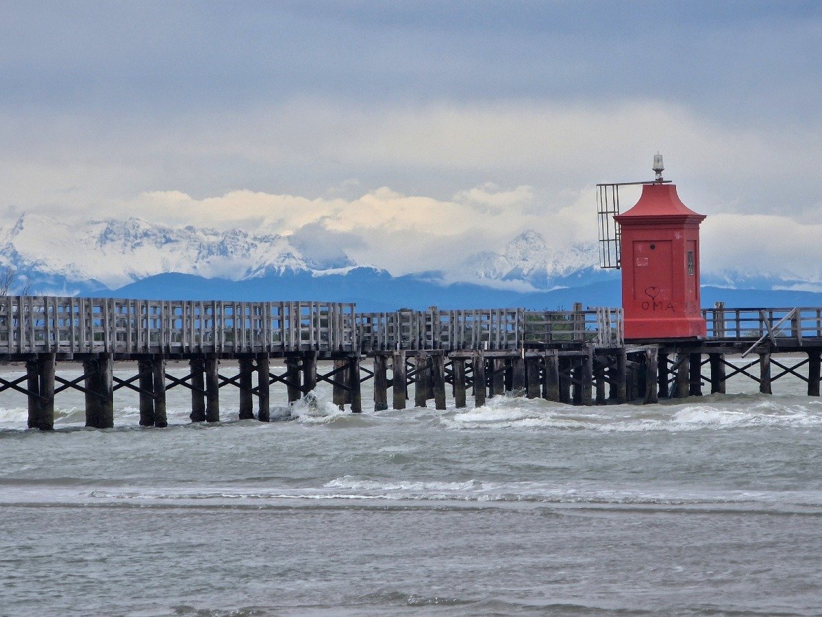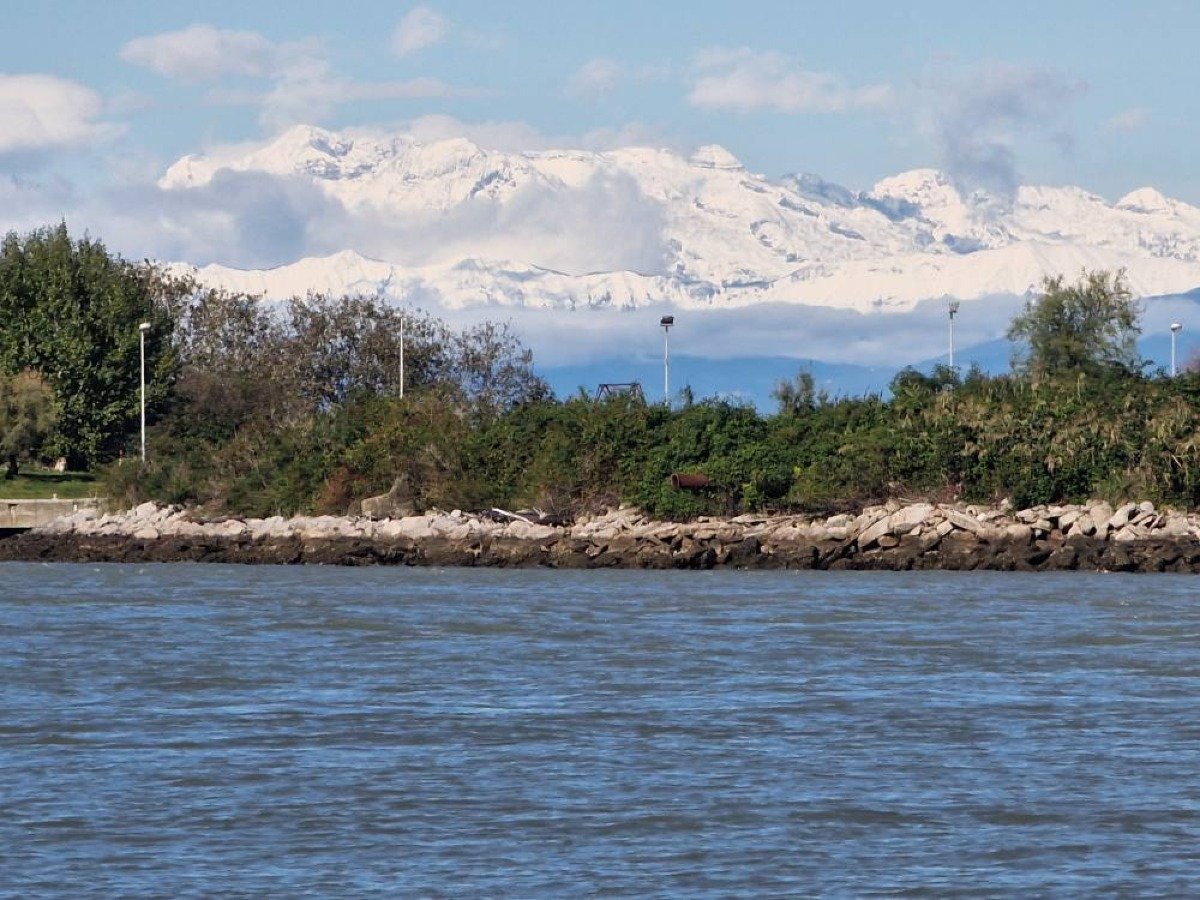 La vera sorpresa è arrivata alzando lo sguardo verso nord: le montagne friulane completamente imbiancate, con la prima neve della stagione caduta nella notte, hanno disegnato un panorama da cartolina. Il contrasto tra il blu del mare Adriatico, il verde delle pinete e il bianco candido delle cime ha offerto una scena rara e affascinante, quasi surreale, che molti non hanno resistito a fotografare.