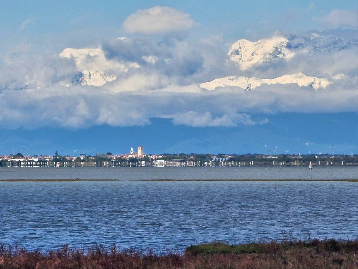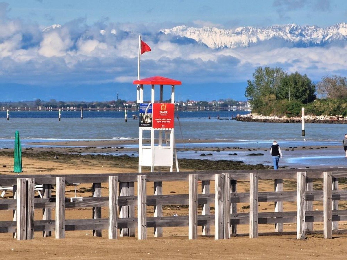 Lignano regala uno spettacolo unico: mare calmo, sole e montagne friulane imbiancate dalla prima neve d’autunno.
