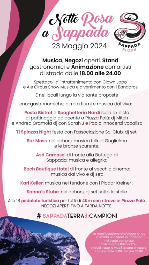 SAPPADA – La cittadina di Sappada si prepara a vivere un evento straordinario: la notte rosa del 23 maggio, alla vigilia della tappa del Giro d’Italia. La viabilità sarà chiusa al traffico automobilistico, i negozi resteranno aperti fino a tarda sera, e lungo la via principale si potranno trovare chioschi gastronomici ed esibizioni di artisti e musicisti a partire dalle 18:00.