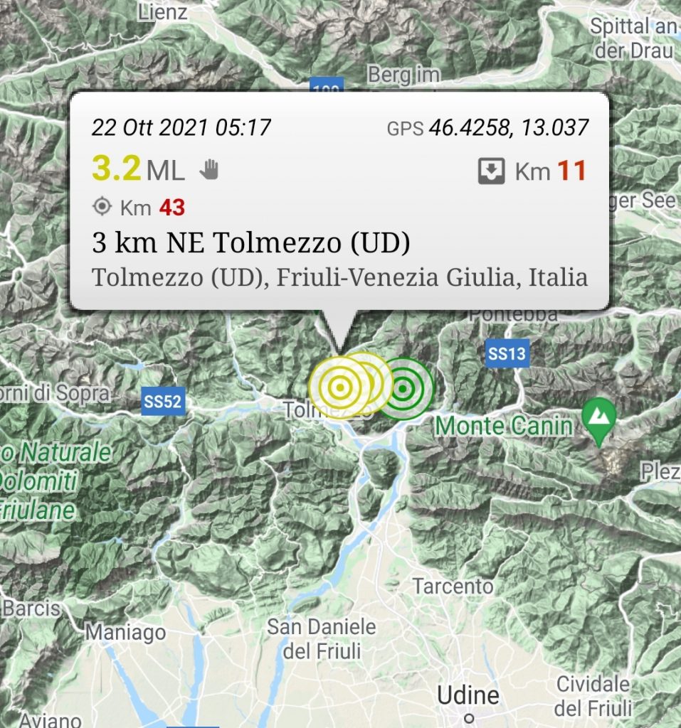 Un terremoto di magnitudo ML 3.2 è avvenuto nella zona: 3 km NE Tolmezzo (UD), il 22-10-2021 alle ore 05:17 con coordinate geografiche (lat, lon) 46.426, 13.037 ad una profondità di 11 km.