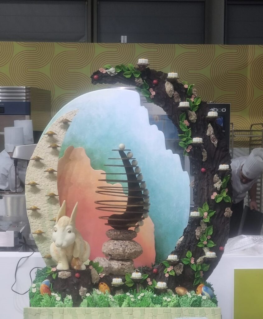 Il tema della competizione era l’allestimento di una vetrina pasquale, con un focus su creatività, estetica e valorizzazione del territorio. I ragazzi hanno realizzato un uovo di cioccolato moderno, bilanciato in verticale, e un coniglio pasquale. La vetrina presentava elementi che celebravano il passaggio dall’inverno alla primavera, come un tronco e una corteccia decorati con fiori di marasca e una cascata simbolo di rinascita.