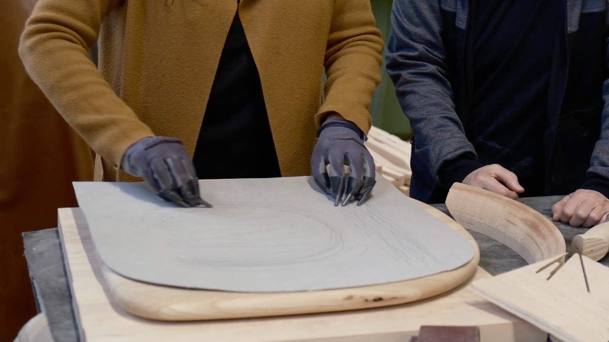 «Questa nuova residenza artistica di Peripheral Memories, si configura come uno spazio di osservazione del lavoro umano» ha spiegato Chiara Isadora Artico. «Marta Azparren si interroga su come sentimenti, corpi ed esperienze soggettive continuino a intrecciarsi con il lavoro e su quale ruolo possa assumere l’arte nel trasformare le aziende in spazi di espressione del potenziale umano». L’esperienza artistica nella fabbrica – che ha coinvolto lavoratrici e lavoratori oltre agli stessi fondatori di New Life Contract - si è sviluppata dall’osservazione diretta delle attività produttive e dei movimenti precisi, reiterati della lavorazione, destinati a scomparire senza lasciare traccia. Mediante guanti dotati di unghie-punzoni questi gesti vengono restituiti sulla superficie lignea che viene graffiata e incisa divenendo così un archivio materiale del lavoro umano. Il materiale ligneo – per lo più composto da scarti di lavorazione– conserva nell’intenzione dell’artista, la memoria del corpo che lo ha attraversato, rendendo visibile ciò che abitualmente resta nascosto.