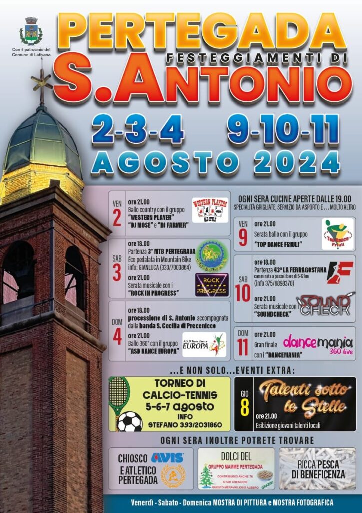 PERTEGADA. La tradizionale festa patronale di S. Antonio a Pertegada è tornata per celebrare le tradizioni locali e offrire una sagra paesana che unisce gastronomia, intrattenimento e sport in un'unica grande manifestazione. Quest'anno, l'evento promette di essere ancora più ricco e coinvolgente, con una varietà di attività che soddisferanno ogni tipo di visitatore.