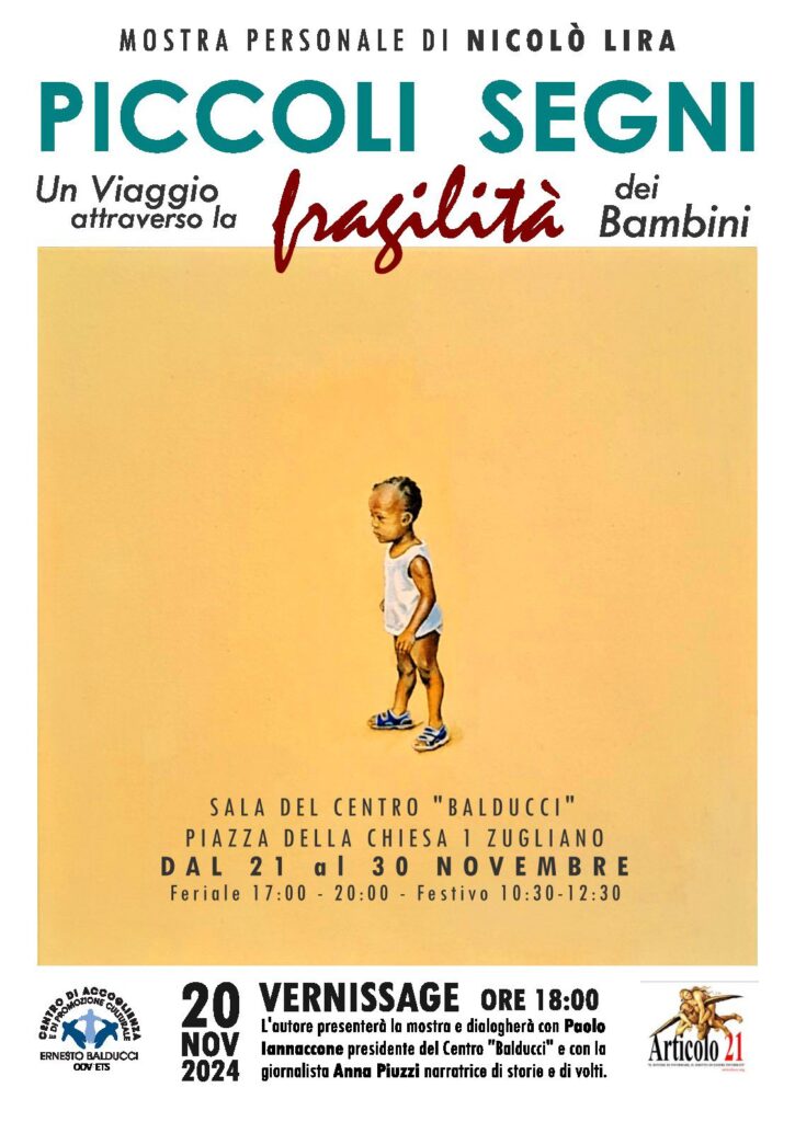 ZUGLIANO – Il Centro Balducci di Zugliano ospiterà, mercoledì 20 novembre 2024 alle 18:00, l’inaugurazione della mostra personale “Piccoli segni. Un viaggio attraverso la fragilità dei bambini” dell’artista cileno Nicolò Lira. L’artista presenterà il suo lavoro durante il vernissage, dialogando con Paolo Iannaccone, presidente del Centro Balducci, e con la giornalista Anna Piuzzi.