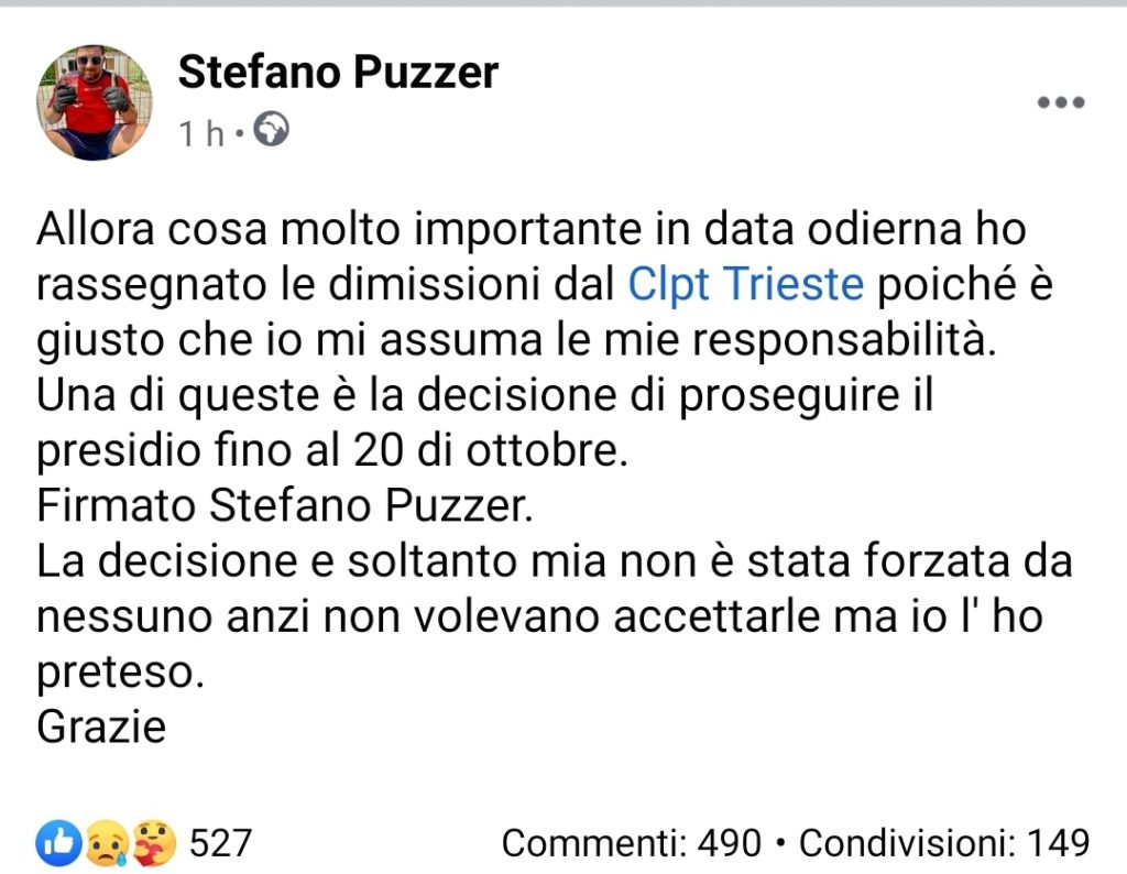 "In data odierna ho rassegnato le dimissioni dal Clpt di Trieste poiché è giusto che io mi assuma le mie responsabilità - è scritto nel post - Una di queste, è la decisione di proseguire il presidio fino al 20 di Ottobre. La decisione è soltanto mia, non è stata forzata da nessuno, anzi non volevano accettarle ma io le ho pretese", conclude.