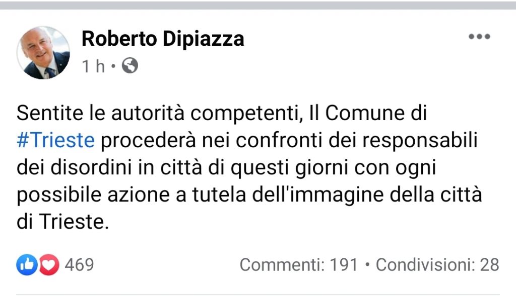 "Sentite le autorità competenti, Il Comune di Trieste procederà nei confronti dei responsabili dei disordini in città di questi giorni con ogni possibile azione a tutela dell'immagine della città di Trieste".