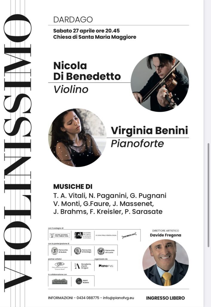 Il prossimo sabato 27 aprile alle ore 20:45, la Chiesa di Santa Maria Maggiore di Dardago aprirà le sue porte per un evento eccezionale nell'ambito della rassegna "Violinissimo". Il giovane e talentuoso Duo composto da Di Benedetto e Benini sarà protagonista di una serata dedicata alla grande musica classica, eseguendo pezzi di alcuni dei più grandi compositori che la storia ricordi.