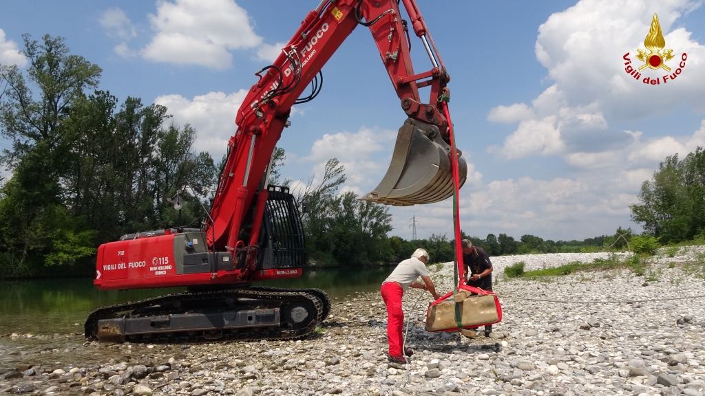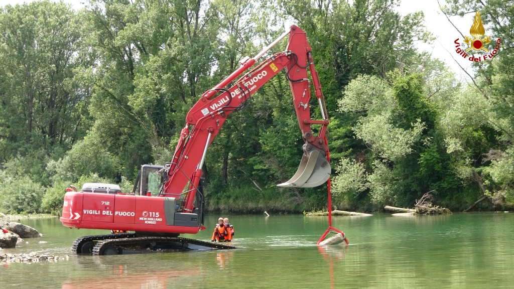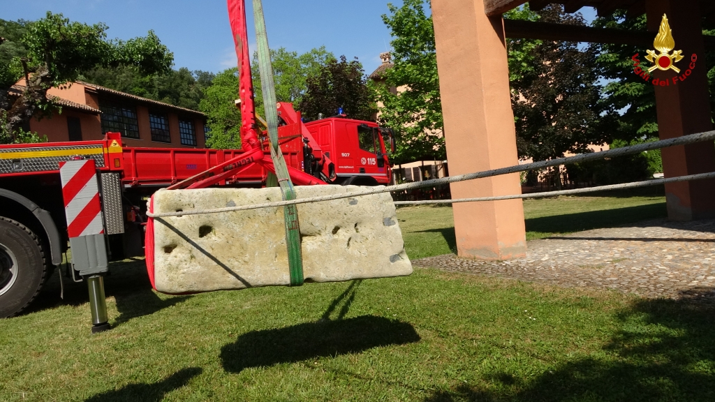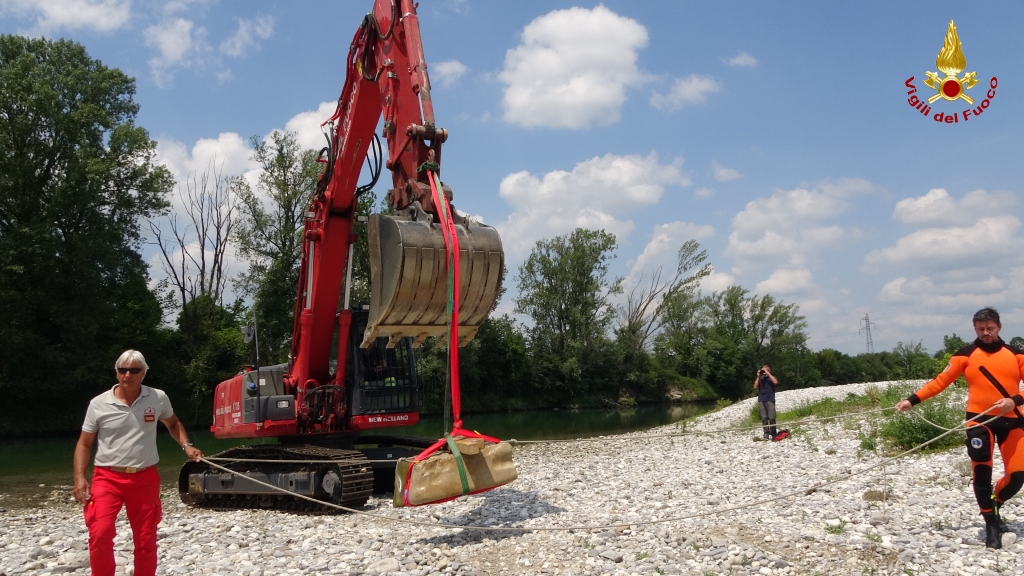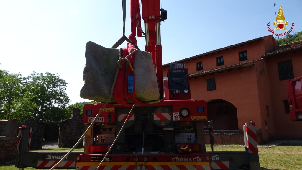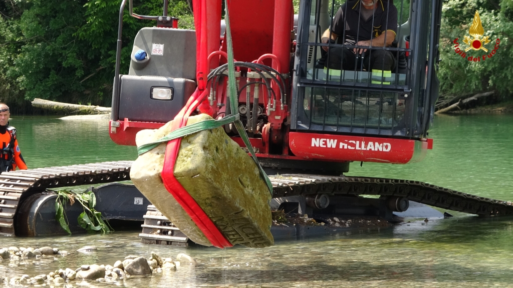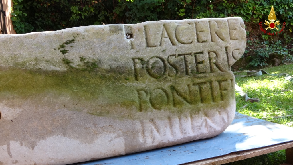 Il prezioso reperto, riportante un’epigrafe frammentaria in lingua latina, è stato imbragato dai sommozzatori del Nucleo S.S.A di Trieste (Nucleo di Soccorso Subacqueo e Acquatico) e recuperato tramite un escavatore cingolato in dotazione al G.O.S. (Gruppo Operativo Speciale) del Comando VVF di Udine.
