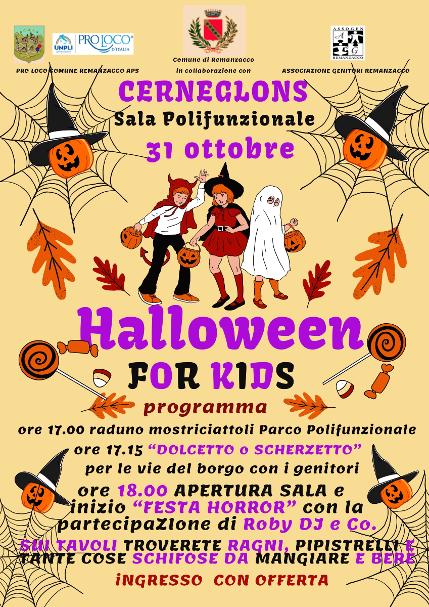 A Cerneglons, presso la Sala Polifunzionale, l’evento “Halloween for Kids” scatterà alle 17 con il raduno dei piccoli “mostriciattoli” al Parco polifunzionale e il tradizionale “dolcetto o scherzetto” per le vie del borgo, accompagnati dai genitori.