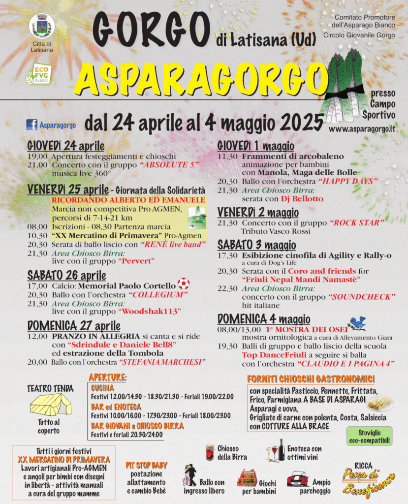 Partecipa alla Sagra degli Asparagi di Gorgo di Latisana dal 24 aprile al 4 maggio 2025. Piatti tipici, eventi sportivi, musica dal vivo e tanto divertimento per tutta la famiglia.