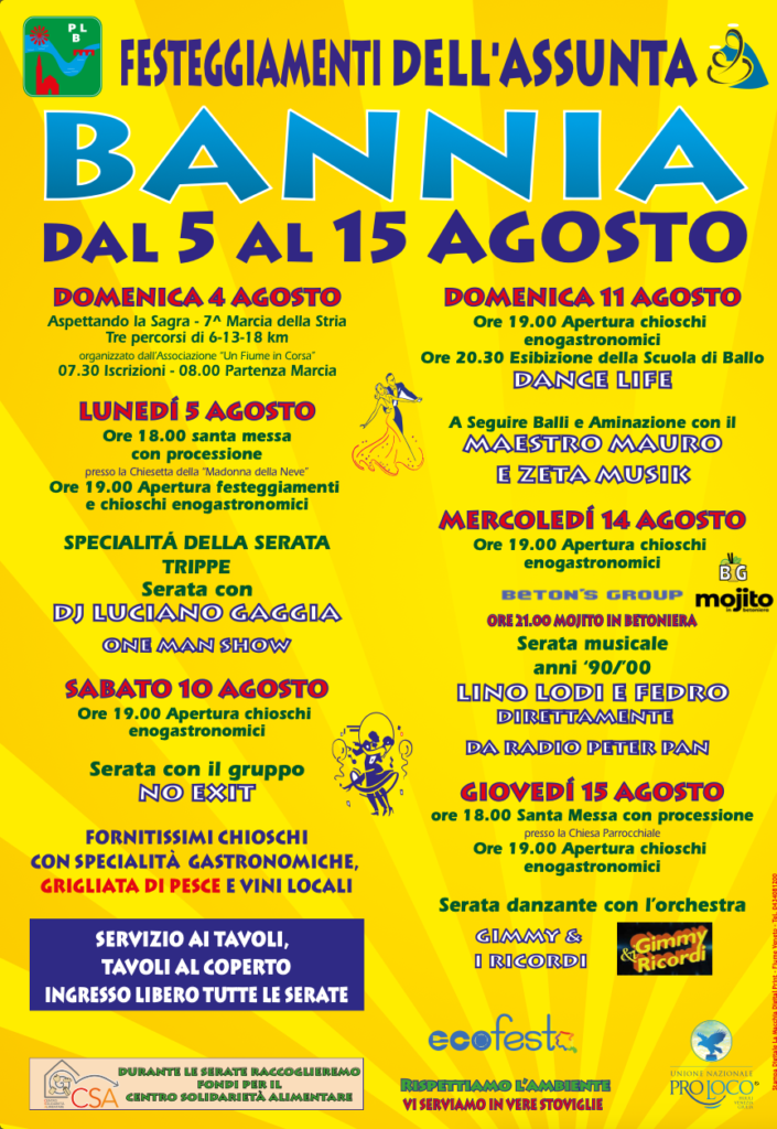 BANNIA (PN) – La tradizionale sagra dell’Assunta, che si svolge a Bannia (PN), è un appuntamento attesissimo che ogni anno attira migliaia di visitatori grazie alla sua organizzazione impeccabile e all'ampia gamma di offerte gastronomiche e intrattenimento. Quest'anno, i festeggiamenti si protrarranno dal 4 agosto 2024 fino al 15 agosto 2024, promettendo un'esperienza unica e coinvolgente.