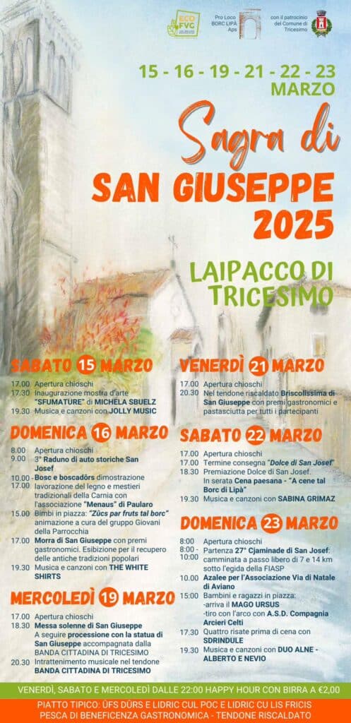 Scopri il programma completo della Sagra di San Giuseppe 2025 a Laipacco di Tricesimo, con eventi, musica, gastronomia e tradizioni. Un appuntamento imperdibile dal 15 al 23 marzo.