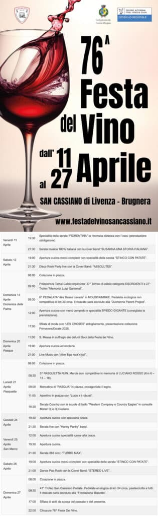 Anche quest’anno ritorna uno degli appuntamenti enogastronomici più longevi e sentiti del Friuli Venezia Giulia: la 76ª Festa del Vino a San Cassiano di Livenza, frazione di Brugnera, in programma da venerdì 11 aprile a domenica 27 aprile 2025. Un evento che celebra la cultura del vino e della convivialità con un ricco calendario di serate musicali, cucina tradizionale, sport e spettacoli.