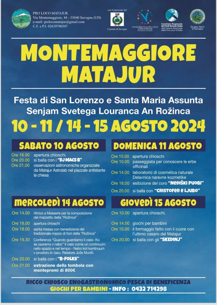 La giornata comincerà con una partenza alle ore 9.30 da Piazza Primo Maggio a Udine. Il comodo autobus di Saporibus ti porterà direttamente alla frazione di Montemaggiore (Savogna), dove avrai l'opportunità di partecipare alla tradizionale festa di San Lorenzo e Santa Maria Assunta. Questa festa rappresenta un'importante manifestazione della cultura e delle tradizioni del Friuli Venezia Giulia, e offre un'opportunità unica per assaporare piatti tipici e partecipare alle celebrazioni locali.