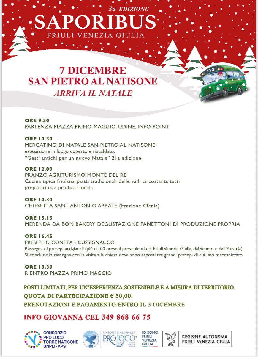 SAN PIETRO AL NATISONE (UD) – L’autobus del gusto si prepara alla sua tappa più evocativa: la giornata prenatalizia di domenica 7 dicembre, quando Saporibus in Friuli Venezia Giulia farà sosta a San Pietro al Natisone per un viaggio che unisce convivialità, tradizioni, buon cibo e un territorio che d’inverno si trasforma in un piccolo scrigno di atmosfere autentiche.