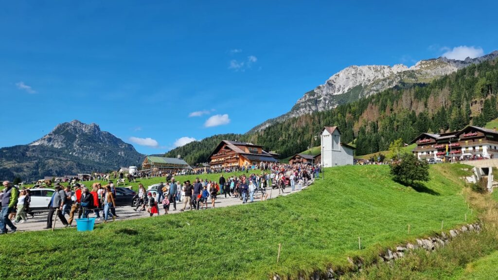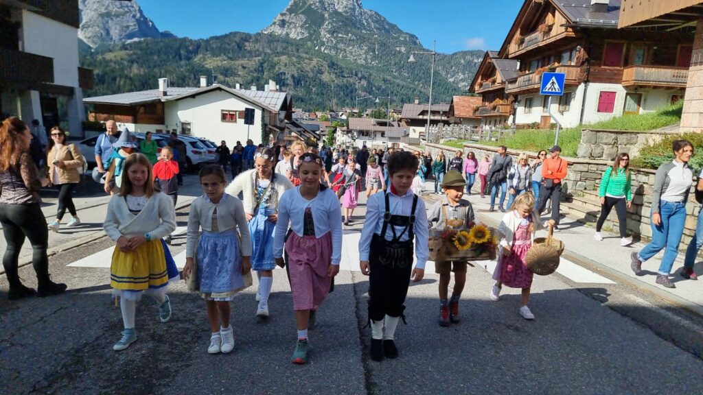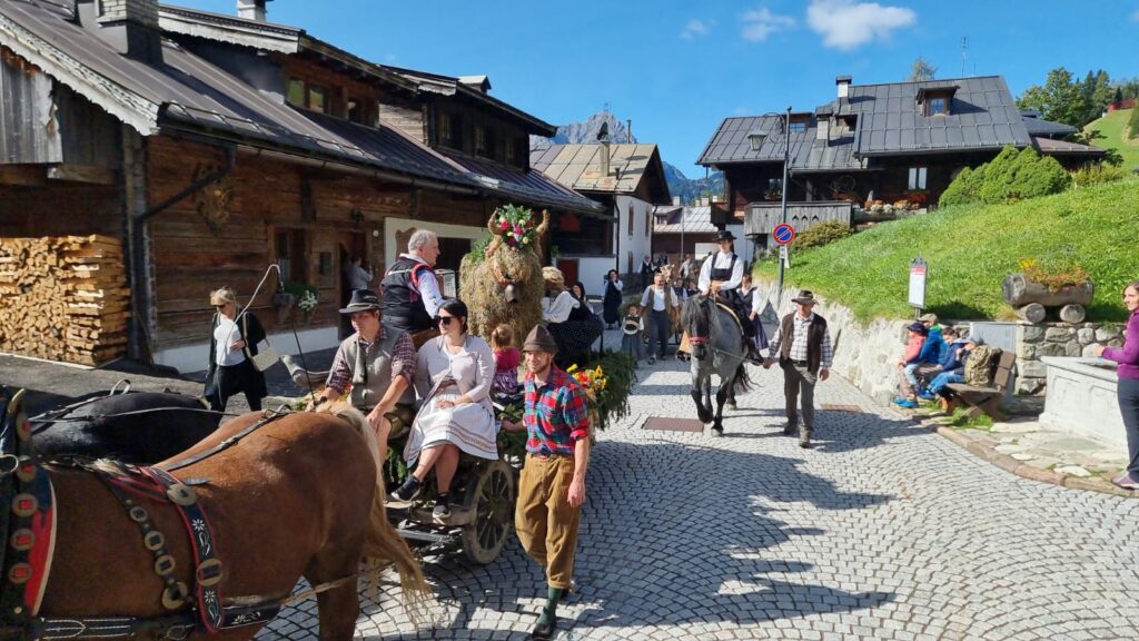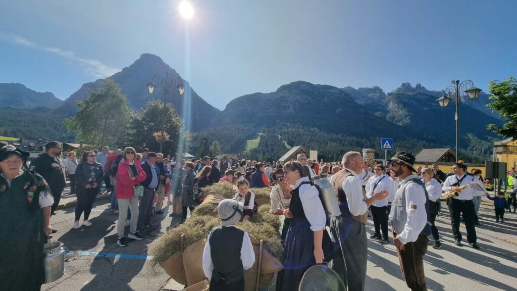 In una meravigliosa giornata dalle temperature estive, un corteo di mucche, poco meno di un centinaio, abbellite con ghirlande di fiori e vistose e colorate campane, accompagnate dai pastori, dalla banda di Sutrio, da cinquanta figuranti vestiti con gli abiti dell’antica civiltà contadina che a loro volta avevano con sé capre, galline, asini e cavalli e dai tanti turisti, è partito alle 10.30 dalla chiesa di Santa Margherita, ha attraversato prima la via centrale di Sappada e per poi addentrarsi nella borgata antica della località e giungere infine nell’area dei festeggiamenti allestita nella zona del campo sportivo.