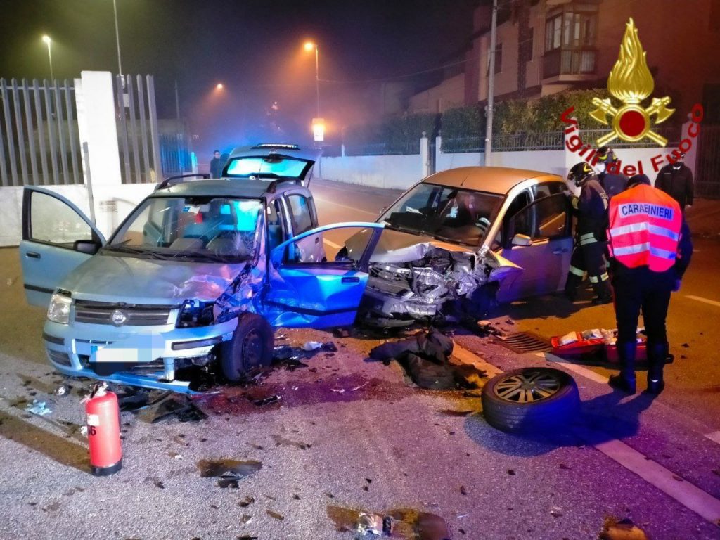 Scontro frontale tra due auto di fronte alla caserma dei Carabinieri: 2 feriti
