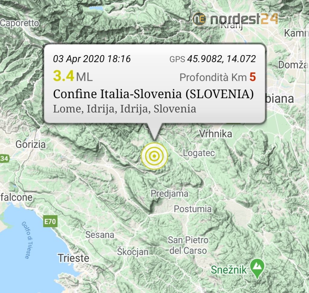 Un terremoto di magnitudo ML 3.4 è avvenuto a Confine tra Italia e Slovenia oggi venerdì 03 aprile 2020 alle ore 18:16