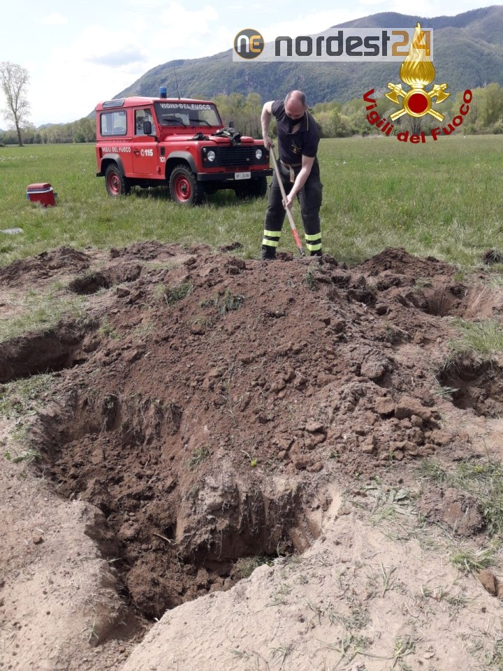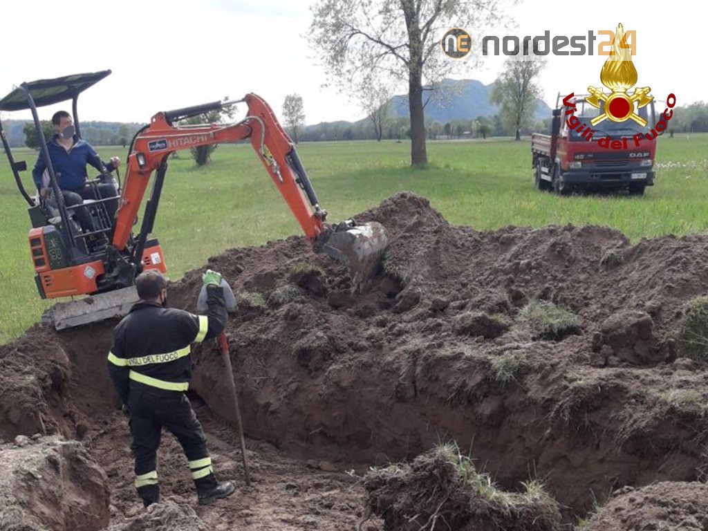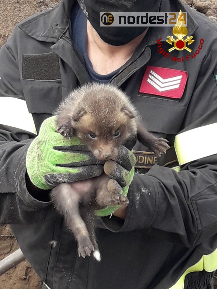 I Vigili del fuoco hanno allora iniziato a scavare con le vanghe trovando però delle gallerie scavate nella terra, si è optato quindi per l’utilizzo di un mini escavatore e dopo varie ricerche e molta terra smossa sono stati trovati prima due cuccioli di volpe e poi il cane che si era infilato nella tana.