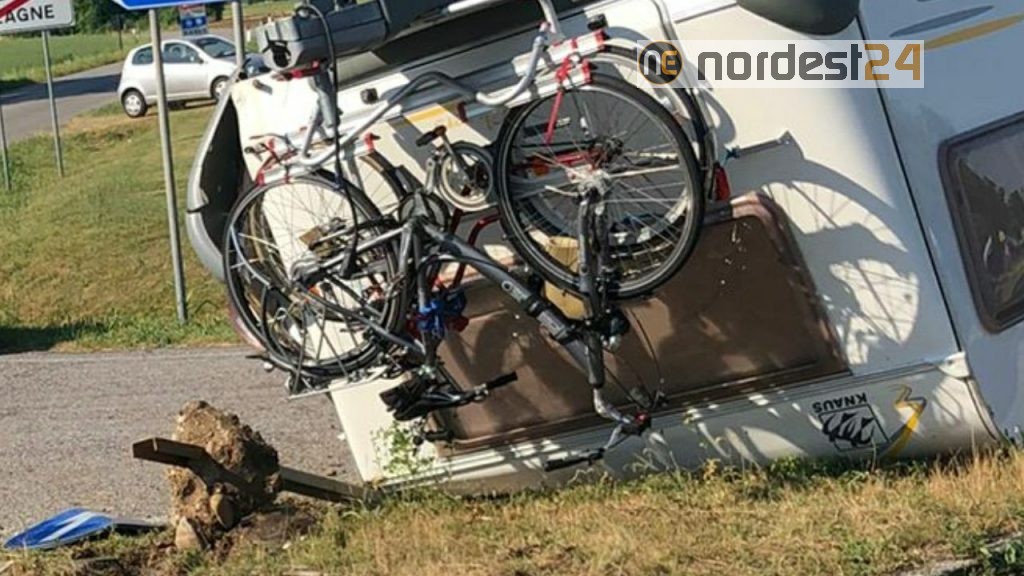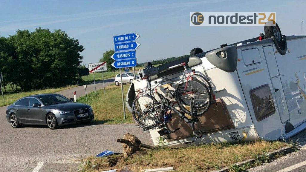 FAGAGNA (UD). Disavventura nella mattina di oggi lunedì 28 giugno 2021 per un cittadino tedesco che transitando nella regione Friuli Venezia Giulia lungo la strada regionale 464 all'incrocio per Plasencis di Mereto di Tomba in comune di Fagagna ha avuto un guasto al gancio traino della roulotte che ha procurato lo stacco del mezzo ed il ribaltamento della stessa.