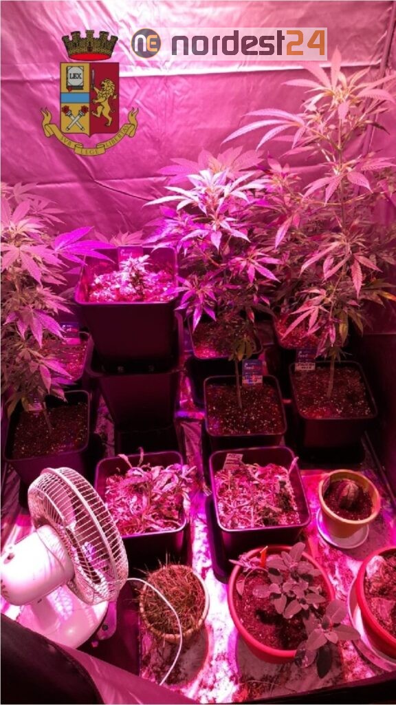 Nella camera da letto dell’abitazione è stato rinvenuto un grow box con a dimora dodici piante, otto di marijuana, due di oppio e due piante grasse cactus peyote contenenti presumibilmente mescalina, già etichettate per specie.