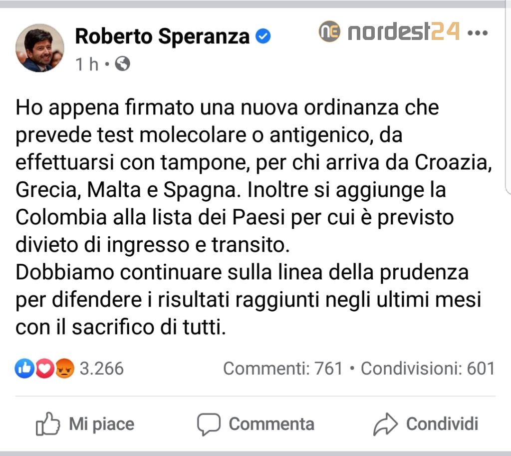 “Ho appena firmato una nuova ordinanza che prevede test molecolare o antigenico, da effettuarsi con tampone, per chi arriva da Croazia, Grecia, Malta e Spagna.