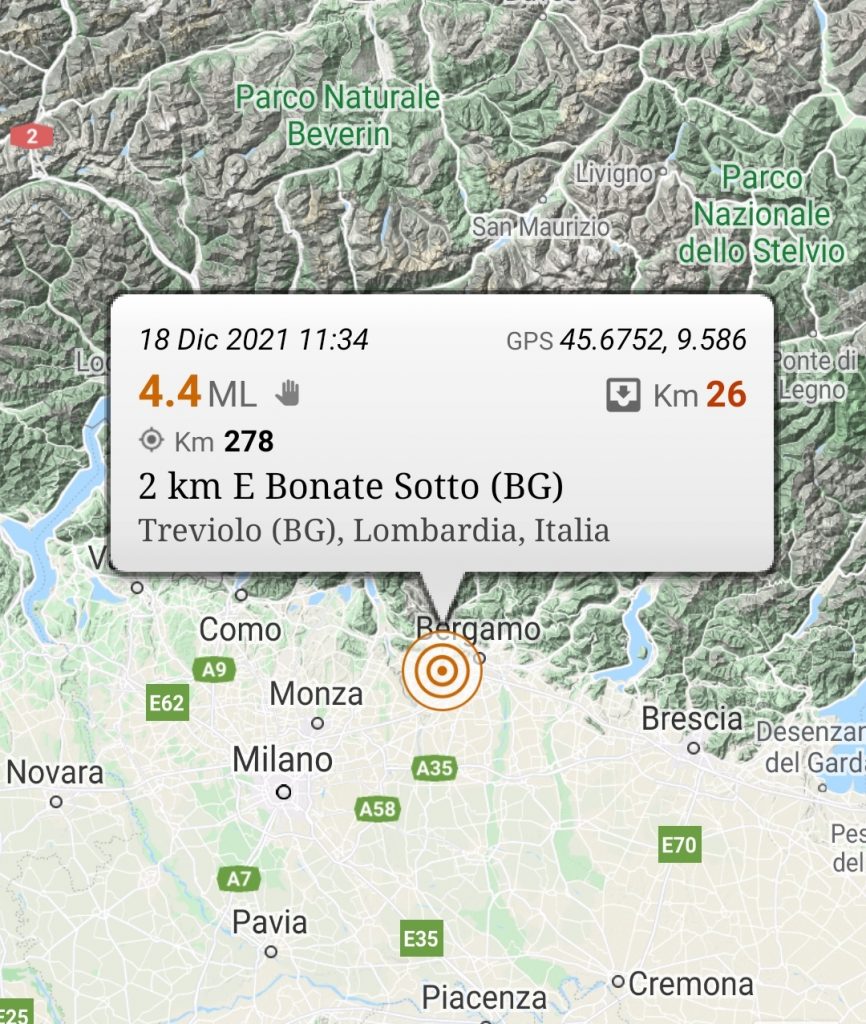 Un terremoto di magnitudo ML 4.4 è avvenuto nella zona a 2 km E Bonate Sotto (BG) oggi sabato 18-12-2021 alle ore 11:34 con coordinate geografiche (lat, lon) 45.675, 9.586 ad una profondità di 26 km.