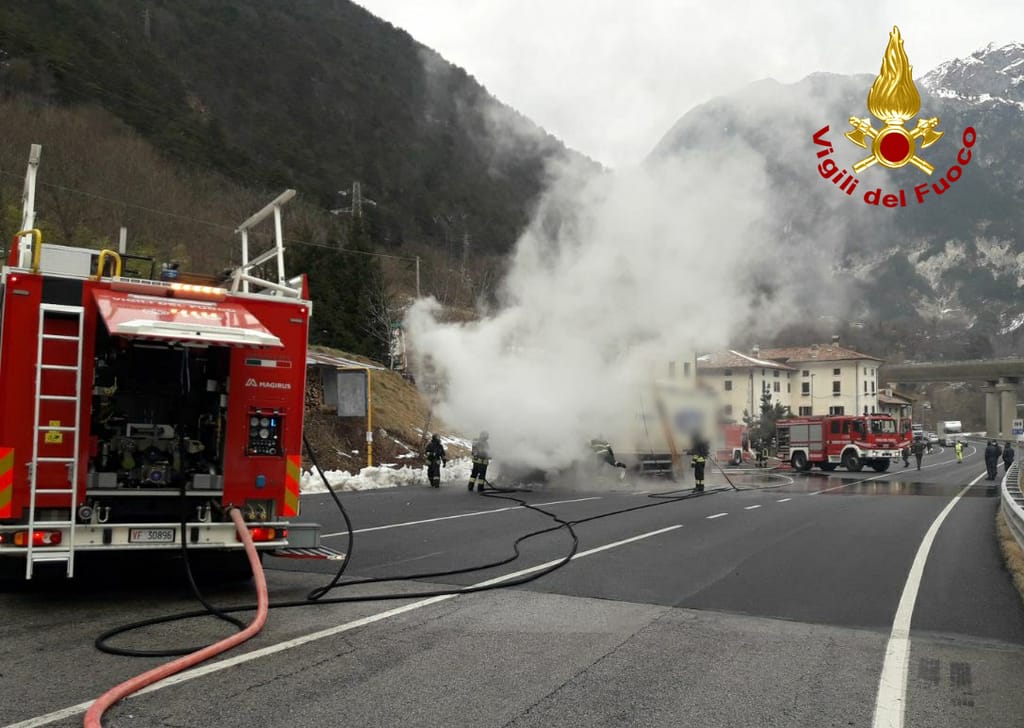 Poco prima delle 10.30 di oggi, 21 dicembre 2021, le squadre dei Vigili del fuoco di Gemona e Tarvisio (UD) sono intervenute sulla SS 13 in frazione Vidali nel comune di Dogna (UD) per l'incendio di un mezzo pesante.