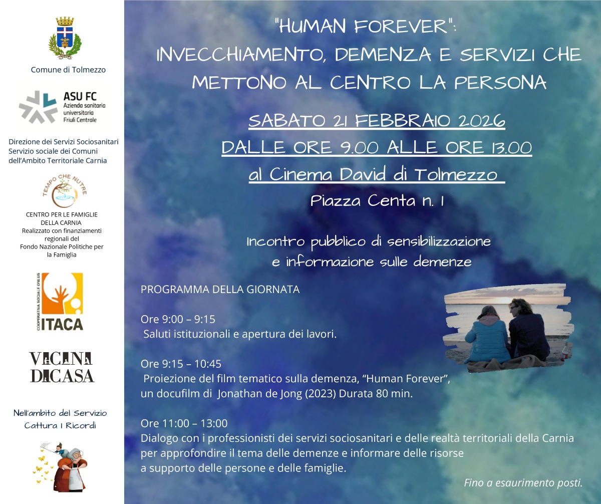 TOLMEZZO (UD) – In Carnia la popolazione anziana è il triplo di quella giovane, a Tolmezzo un incontro pubblico per costruire una comunità competente e inclusiva di fronte alla sfida delle demenze. Promuovere una cultura della cura consapevole, per sostenere la quotidianità delle persone con demenza o Alzheimer, ma anche delle loro famiglie e caregiver. Sabato 21 febbraio dalle 9 alle 13 al Cinema David di Tolmezzo “Human Forever”, una mattinata dedicata alla scoperta dei servizi e delle risorse disponibili in Carnia a favore delle persone con deterioramento cognitivo e delle loro famiglie. Ingresso gratuito fino ad esaurimento dei posti.