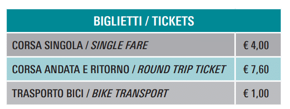 Il trasporto delle biciclette è consentito fino al limite massimo di capienza della motonave e a discrezione del comandante. È consigliabile informarsi in anticipo, soprattutto nei giorni di maggiore affluenza.