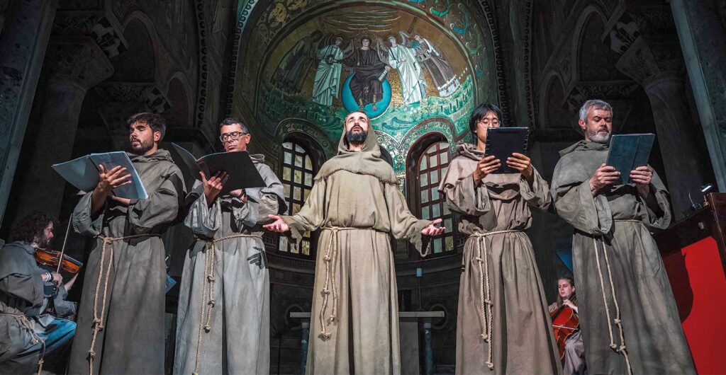 "Transitus" è una sacra rappresentazione che narra gli ultimi momenti della vita di San Francesco, rievocando il suo legame profondo con la Terra e il Cielo. La composizione è firmata dal noto compositore friulano Cristian Carrara, il quale ha rielaborato un corpus liturgico di canti gregoriani associati alla liturgia del Transito di Francesco, conservata e cantata dai francescani.